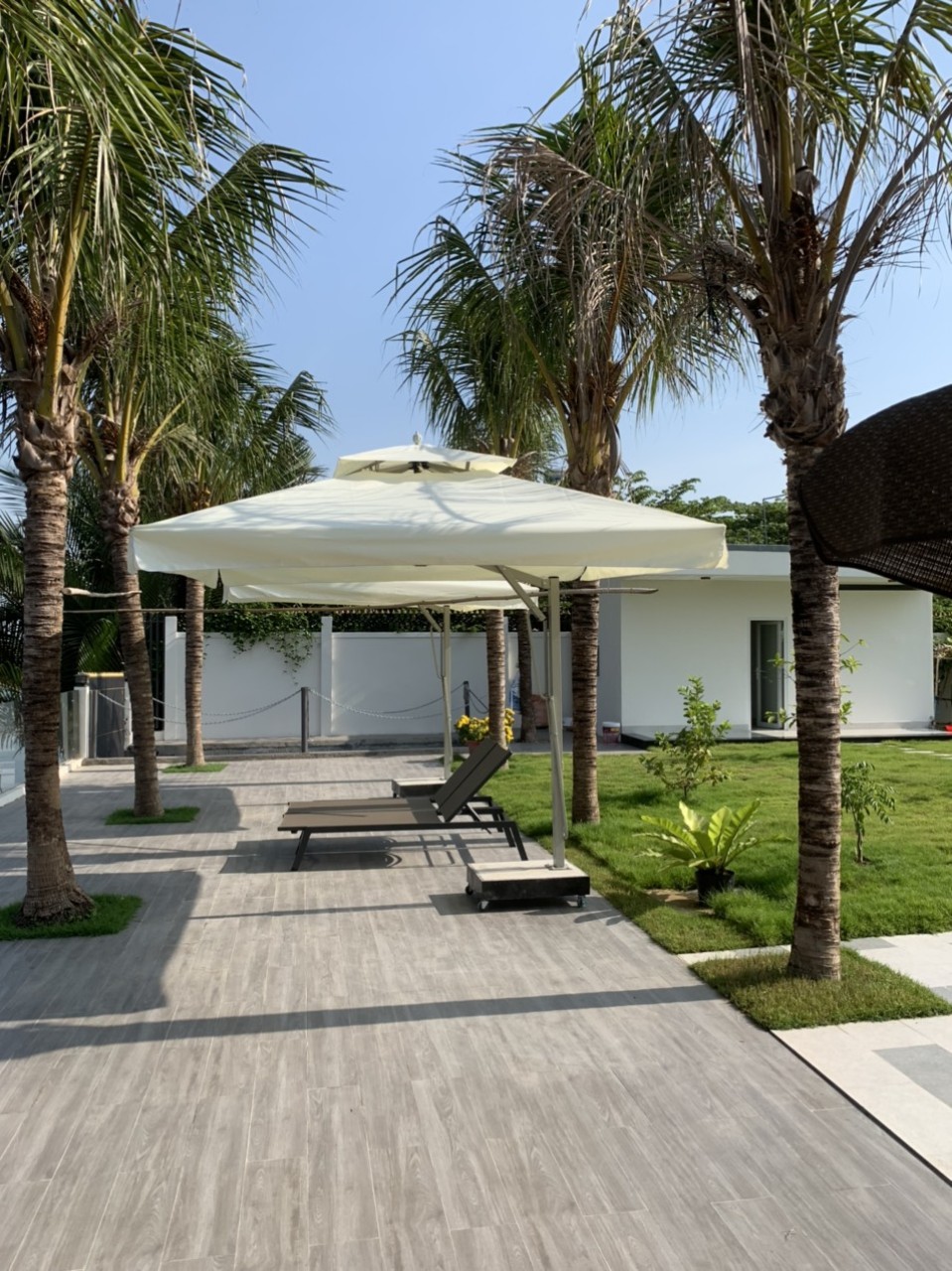 Một cây dù lệch tâm có thể che 2–4 ghế nằm, rất phù hợp cho khu vực hồ bơi.