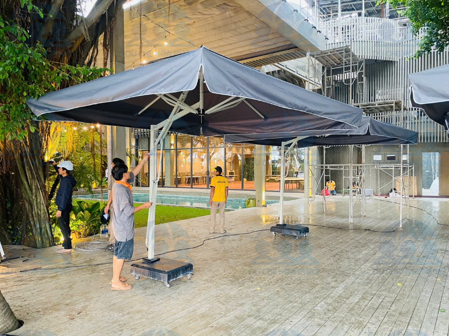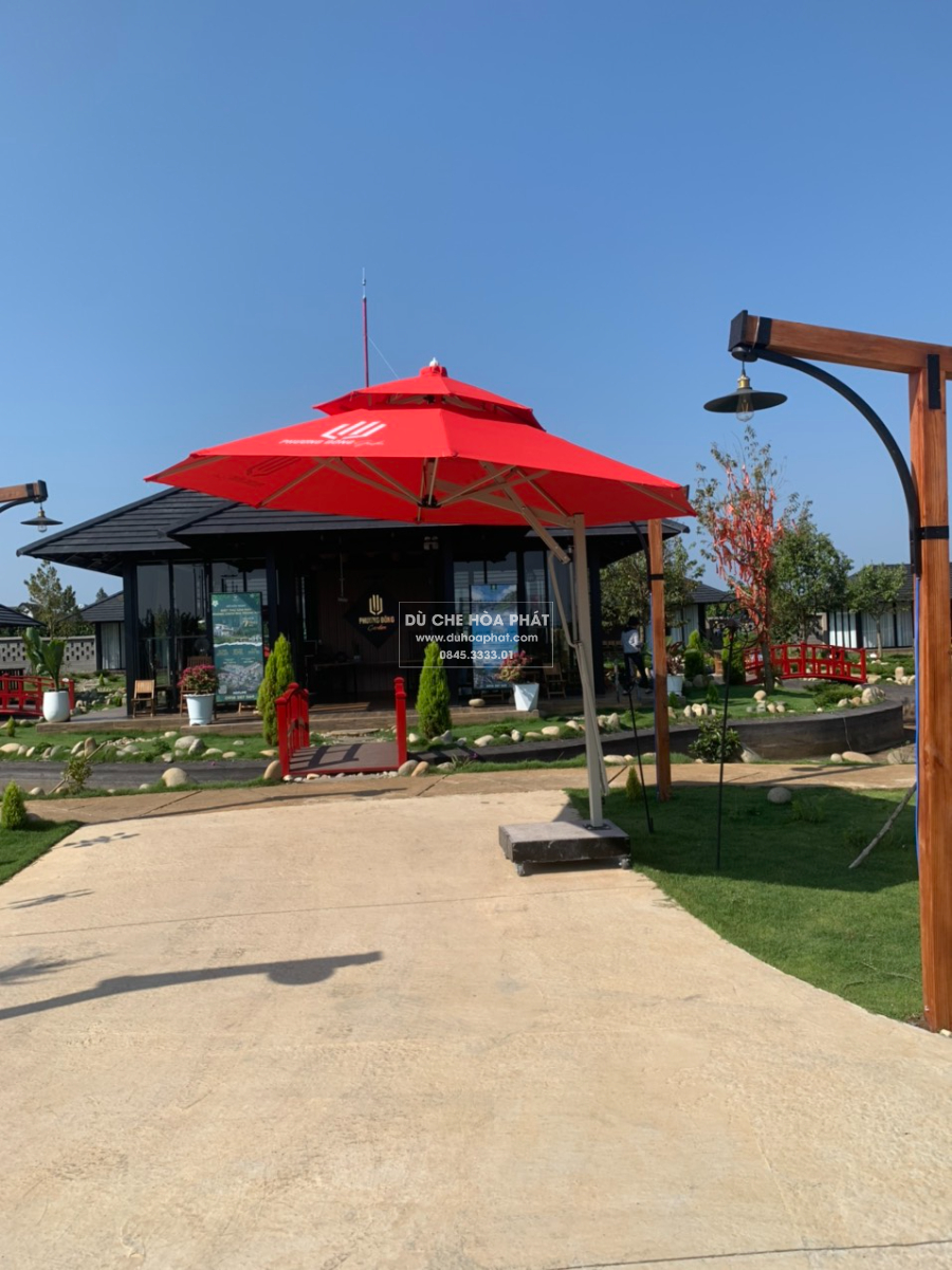 Dù lệch tâm giúp che phủ khu vực bàn ghế mà không vướng trụ giữa, rất phù hợp với quán cafe sân vườn và không gian mở tại Đồng Nai.