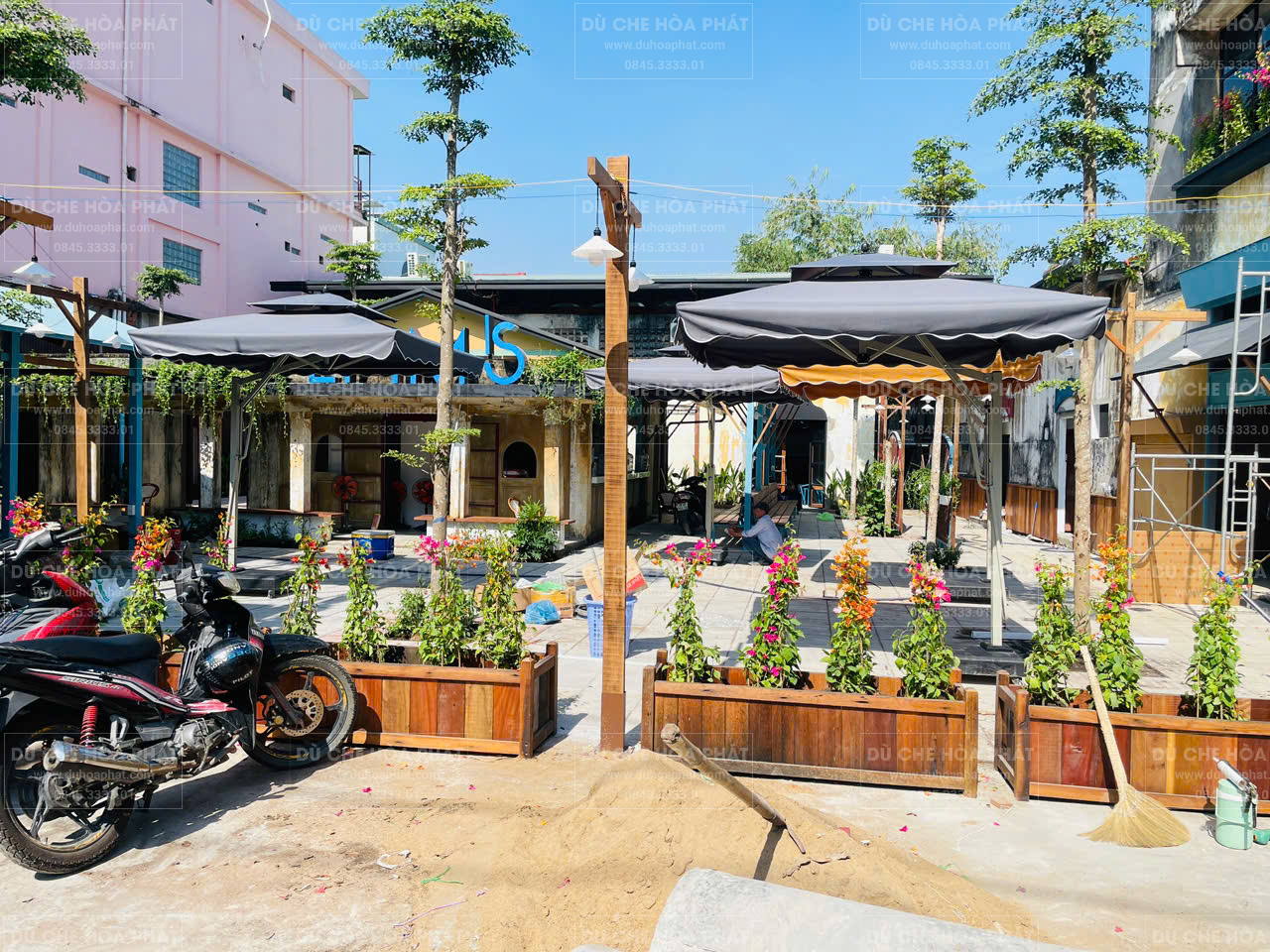 Với quán có sân rộng, bố trí bàn theo cụm, dù lệch tâm vuông giúp che phủ đồng đều và dễ sắp xếp chỗ ngồi.