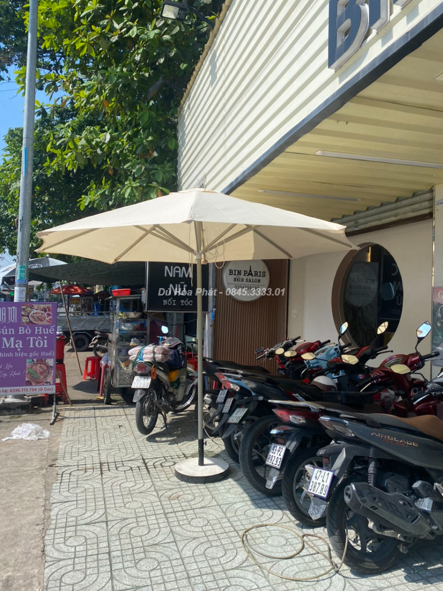 Với quán nhỏ, khu vực khuất gió hoặc trong hẻm, dù đứng tâm là giải pháp che nắng tiết kiệm và dễ sử dụng.