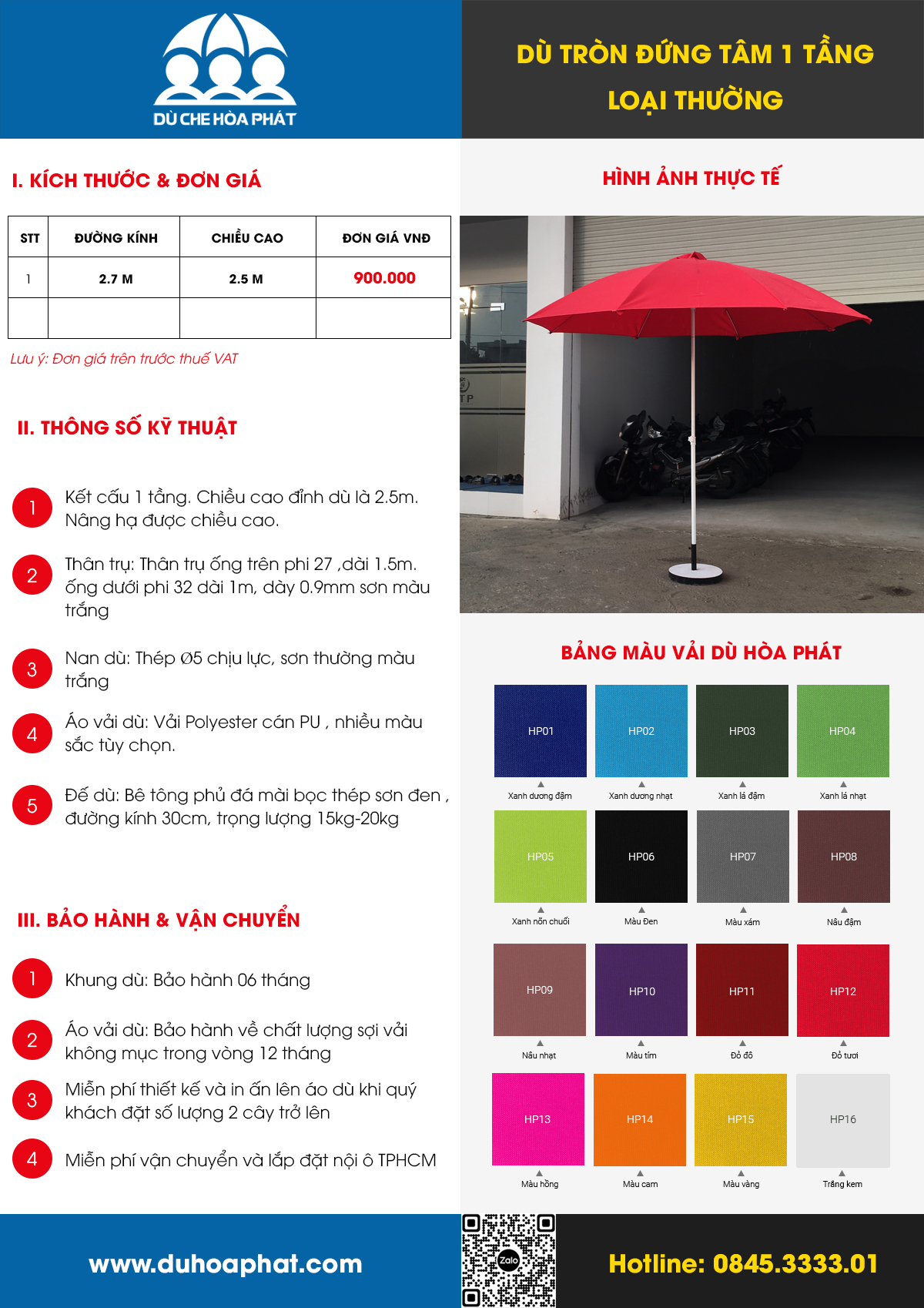 1. Thông Số Kỹ Thuật Dù Đứng Tâm Tròn 2.7m